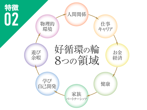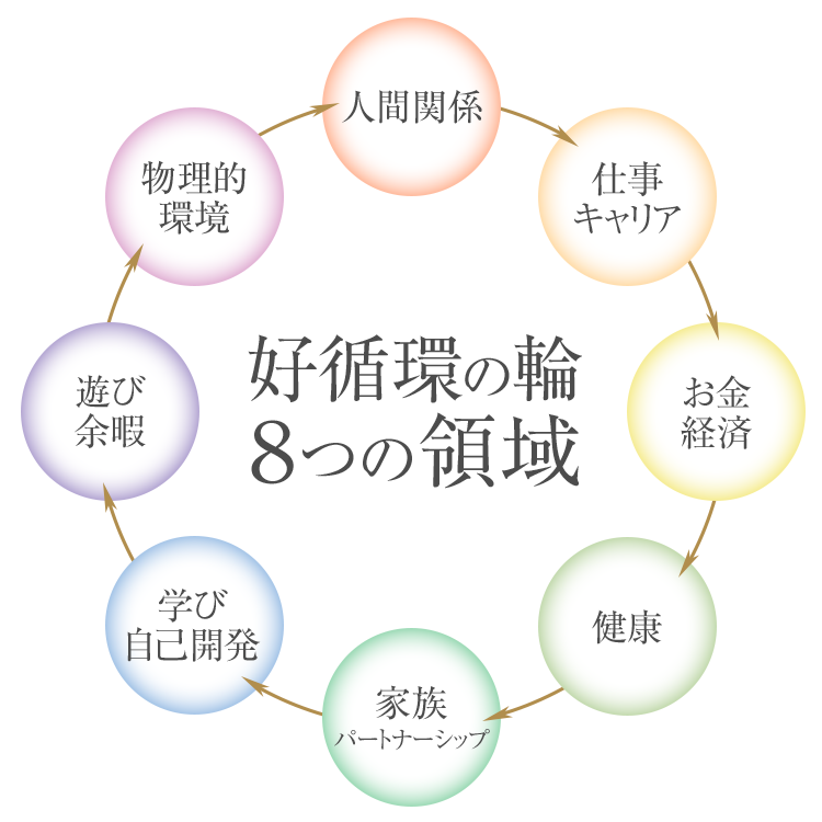 周りの円は、「好循環の輪」の8つの領域を表現しており、